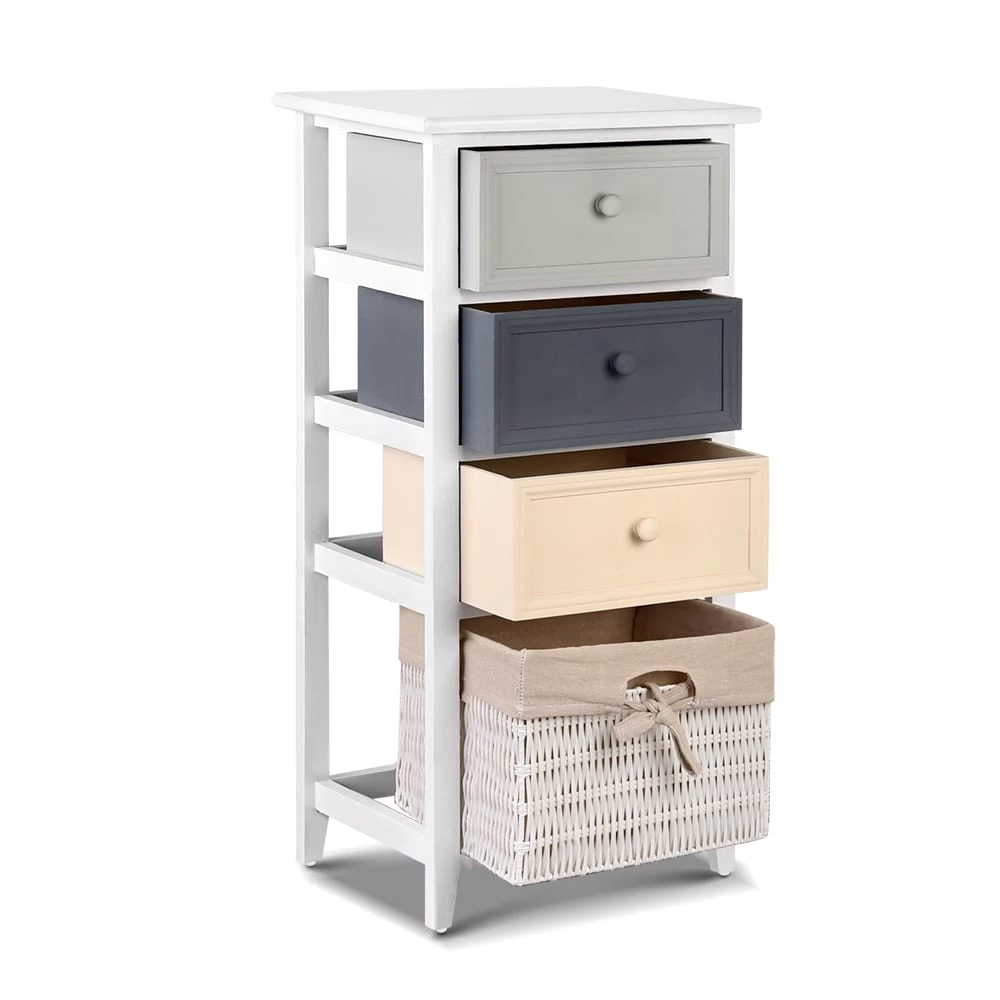 Add a touch of chic presence to your storage requirements with the Artiss storage dresser. Beautifully crafted in an endearing combination of Paulownia wood, MDF board and plywood and PP material, this dresser is simply charming in so many ways. The design is always appealing and its practicality is enhanced by the three deep drawers and one removable basket with an inner polyester cloth liner that is washable for easy maintenance. Use the cabinet in any room and it will match perfectly with the décor that you have with it neutral white tones. Not least, the anti-scratch feet pads will help to keep your floor in pristine condition. The cabinet comes fully assembled.