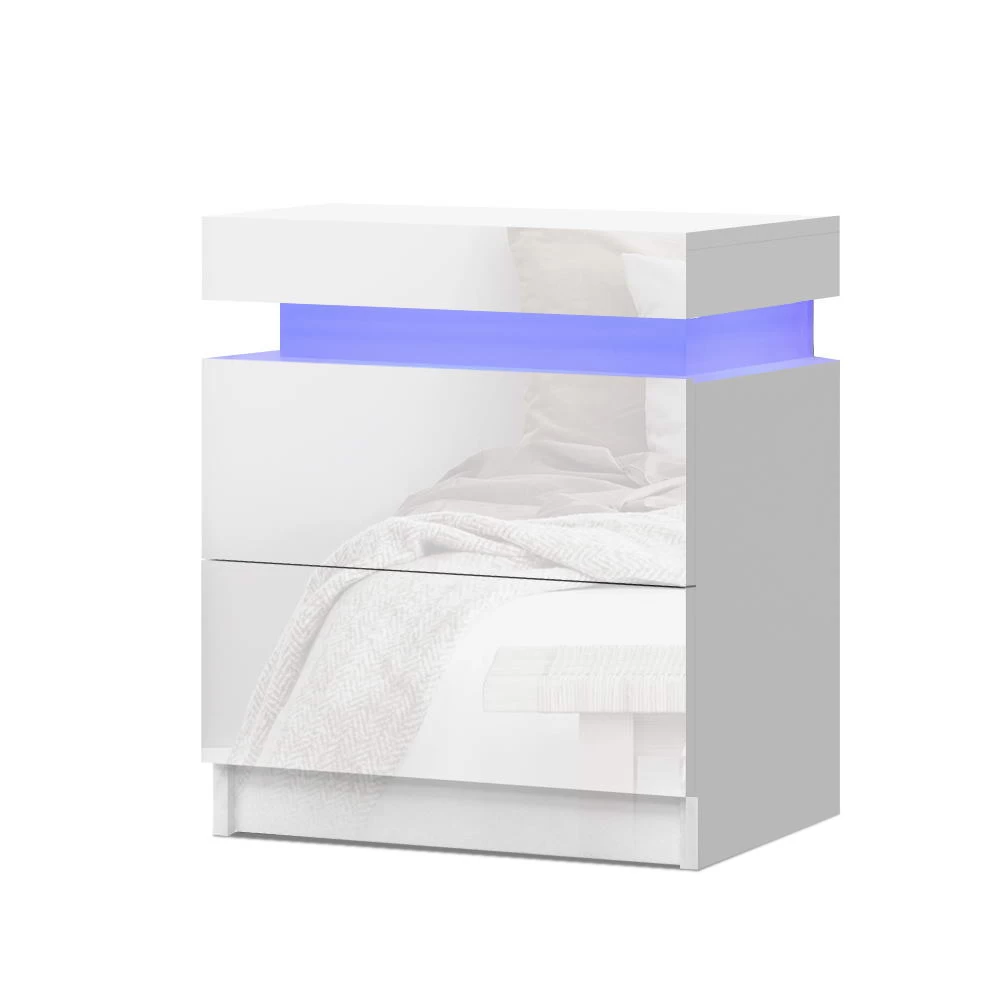 Tired of fumbling in the dark for a light switch in the middle of the night? With our Artiss LED Bedside Table, your problems are solved. The bedside table comes with built-in LED lighting that can be customised into 16 different colours to suit your preference. Not only will it create a beautiful ambience, it will also save you from buying extra bedside lamps or nightlights. Two deep drawers sliding on smooth anti-rust runners provide ample storage space. There is also a top storage compartment that opens with a lift-up lid like a treasure trunk, which you can fittingly fill with your own personal treasures. Better still, the handle-free design gives it a modern vibe that stands out from the mundane. Quality made with 15mm thick melamine particle board and UV high gloss finish, the bedside table is durable and easy to maintain. And it will be the perfect addition to your modern bedroom with its contemporary and linear design. Or you can keep one in the living room to wow all your houseguests.
