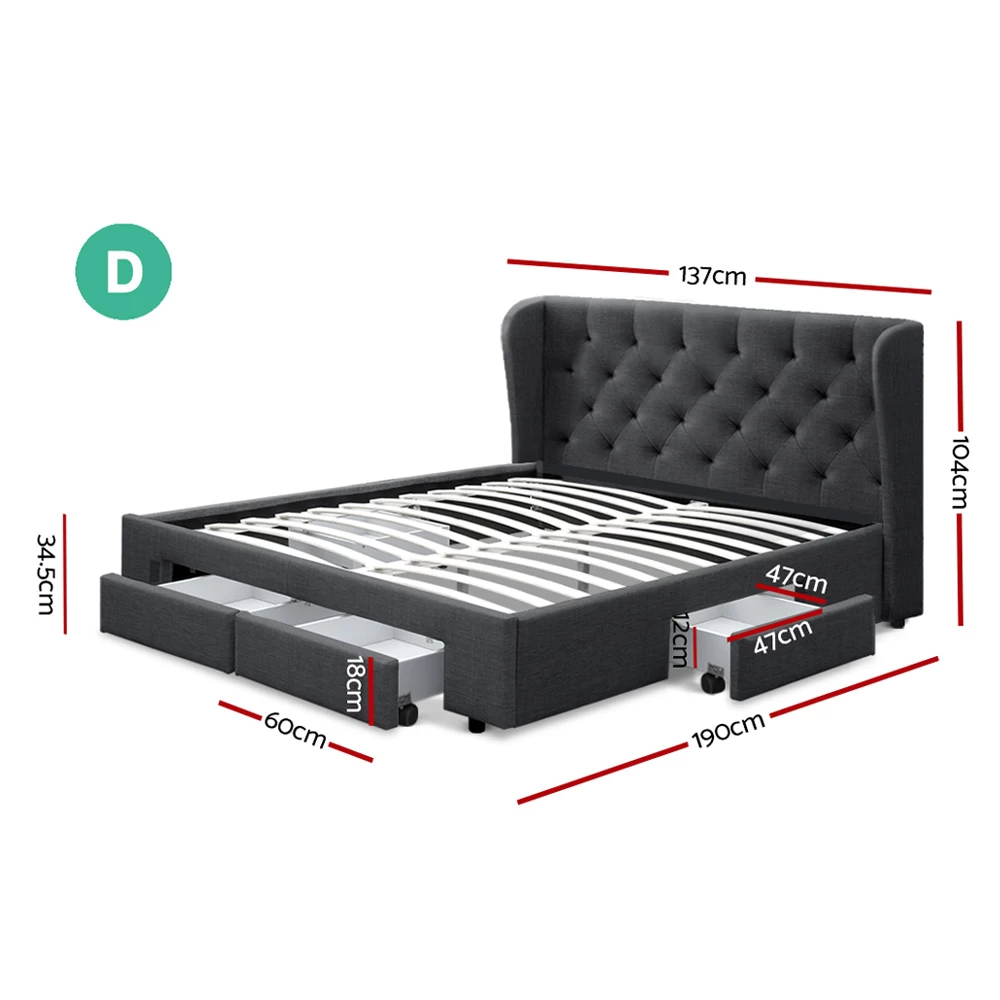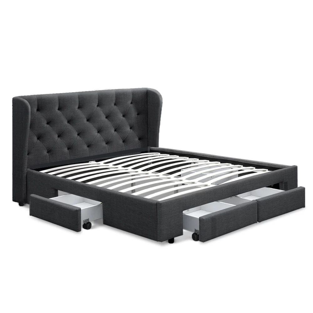Of particular interest is the tufted headboard that really gives the Bed Frame a designer-class status. Simply oozing with elegance and sophistication in every detail. What’s more, underneath the Bed Frame, you’ll find four spacious drawers to store all your seasonal beddings and linen and a host of other personal essentials. No more clutter and loads of useable storage right under you. Better still, the drawers are set on wheels for easy access sliding in and out.