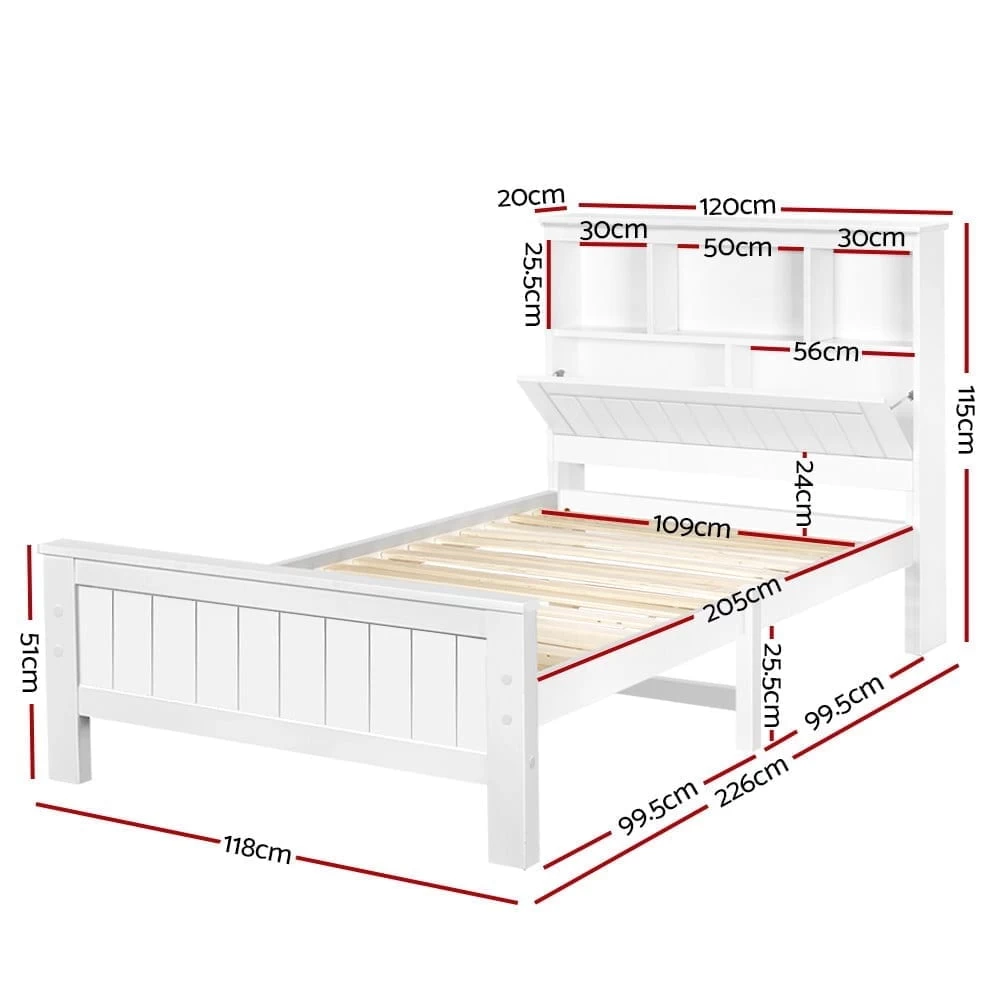 Made of natural pine wood, the Artiss Conqueror Bed Frame is ideal for kids as it for any adult. Strong and sturdy, the bed frame comes with a solid plywood slated base, reinforced supports across the frame, heavy-duty steel fixings and smooth edges all round. Finished in a non-toxic, eco-friendly white paint, the neutral coloured bed frame is also very practical with ample storage from a headboard that comprises three open compartments and a closed shelf that folds down as well as more room beneath the bed frame for optional trundle drawers or any storage boxes. Fact it, this charming bed frame is designed to please in more ways than one.