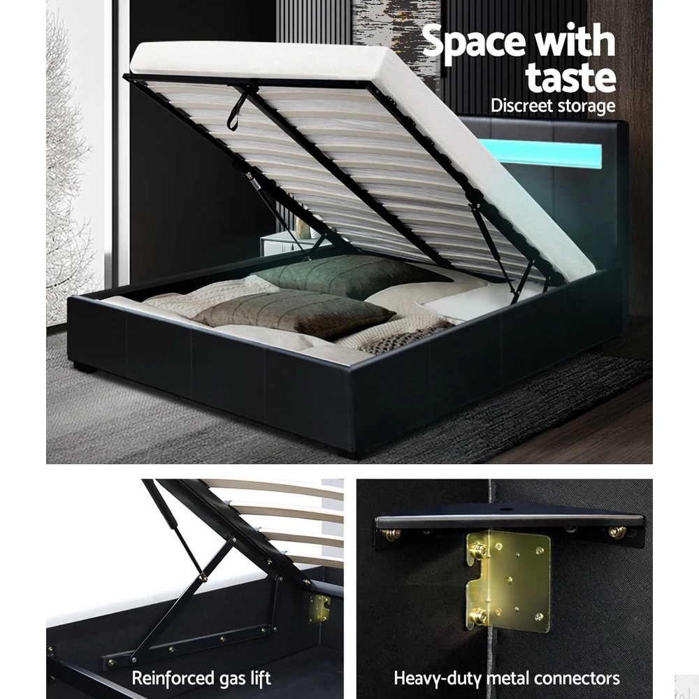 On the outside, this bed frame looks like just any other quality bed frame. Beautifully padded with generous foam and covered in PU leather. Strong steel frame with high grade steel centre rails, heavy-duty bars and arched slat base. Large and comfortable headboard. But with one easy gas lift of the bed base, the bed frame becomes an instant storage area with acres of space for your bedding essentials. Simply store your extra pillows, bed sheets, cushions and more in the storage compartment and hide them away for the season. Even better, you no longer have to fumble in the dark for a light switch in the middle of the night with this bed frame. It comes with built-in LED lighting that can be customised into 16 different colours and 4 flashing modes to suit your preference. Not only will the illuminated bed frame create a beautiful ambience, it will also save you from buying extra bedside lamps or nightlights.