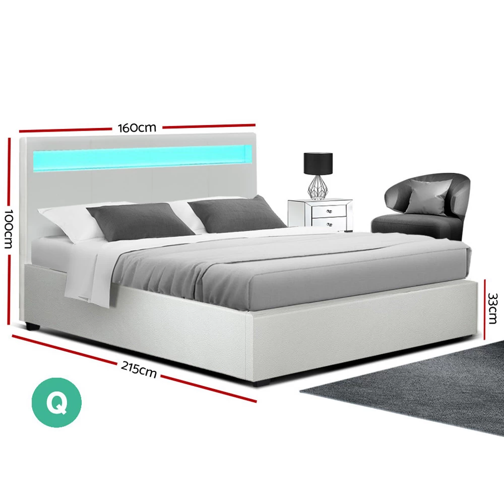 On the outside, this bed frame looks like just any other quality bed frame. Beautifully padded with generous foam and covered in PU leather. Strong steel frame with high grade steel centre rails, heavy-duty bars and arched slat base. Large and comfortable headboard. But with one easy gas lift of the bed base, the bed frame becomes an instant storage area with acres of space for your bedding essentials. Simply store your extra pillows, bed sheets, cushions and more in the storage compartment and hide them away for the season. Even better, you no longer have to fumble in the dark for a light switch in the middle of the night with this bed frame. It comes with built-in LED lighting that can be customised into 16 different colours and 4 flashing modes to suit your preference. Not only will the illuminated bed frame create a beautiful ambience, it will also save you from buying extra bedside lamps or nightlights.