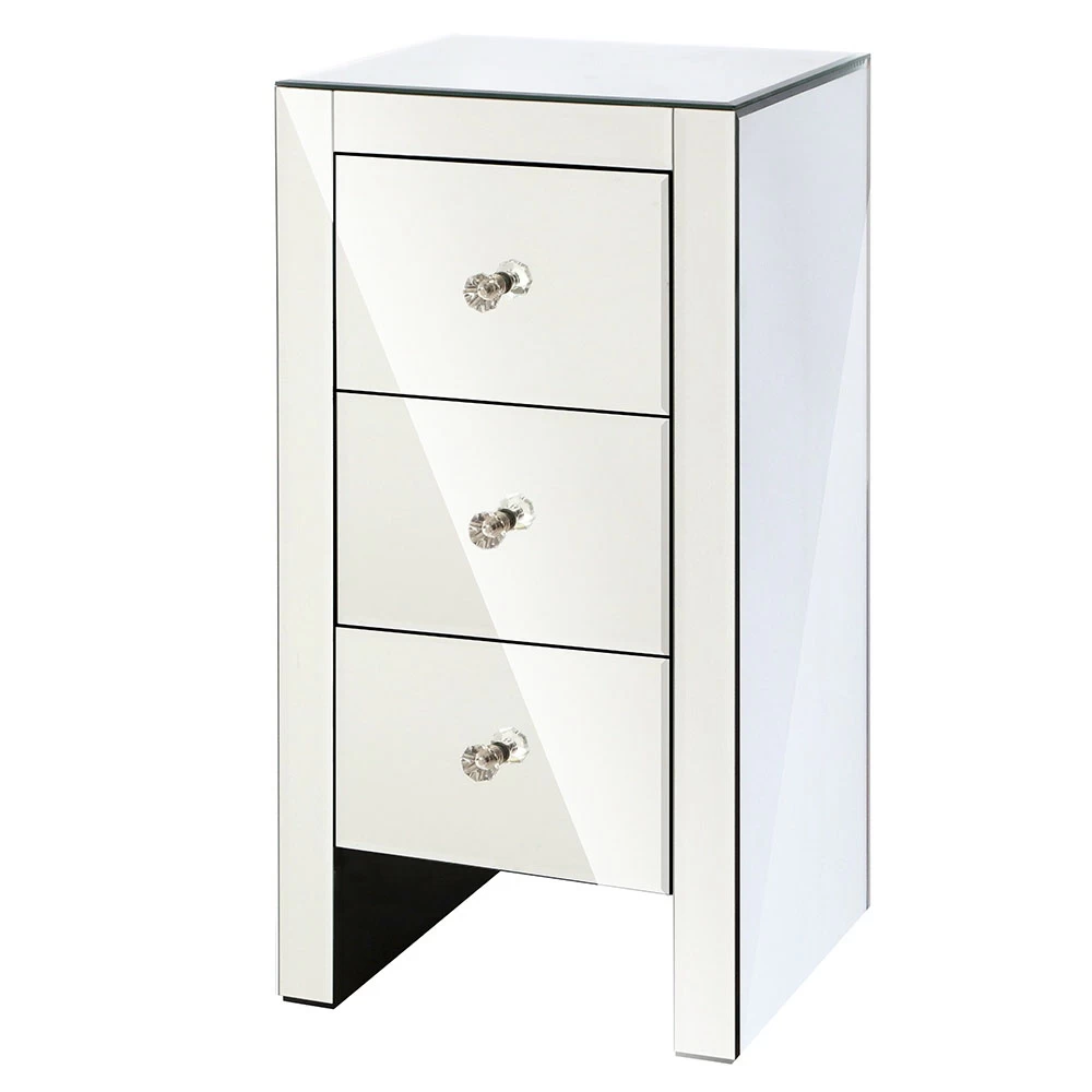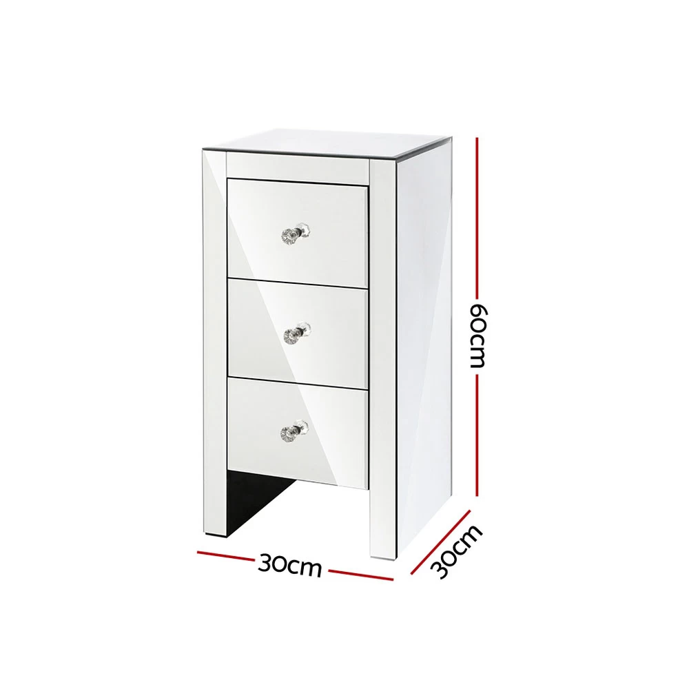 Enjoy all the glitz and glamour that comes with the Artiss Quenn Bedside Drawers. Cladded with bevelled mirror glass and a durable E1 grade MDF board frame, the elegant drawers are simply stunning from any angle that reflects its mirrored beauty. Plus, the effect also gives your room a larger-than-life look of space and size. The three drawers offer ample storage space and are fitted with coated metal sliders for smooth operation. Not least, the crystal glass effect handles also add a scintillating touch to the drawers with an exquisite appeal. Easy to maintain and clean, our bedside drawers is all about grandeur living made simple.