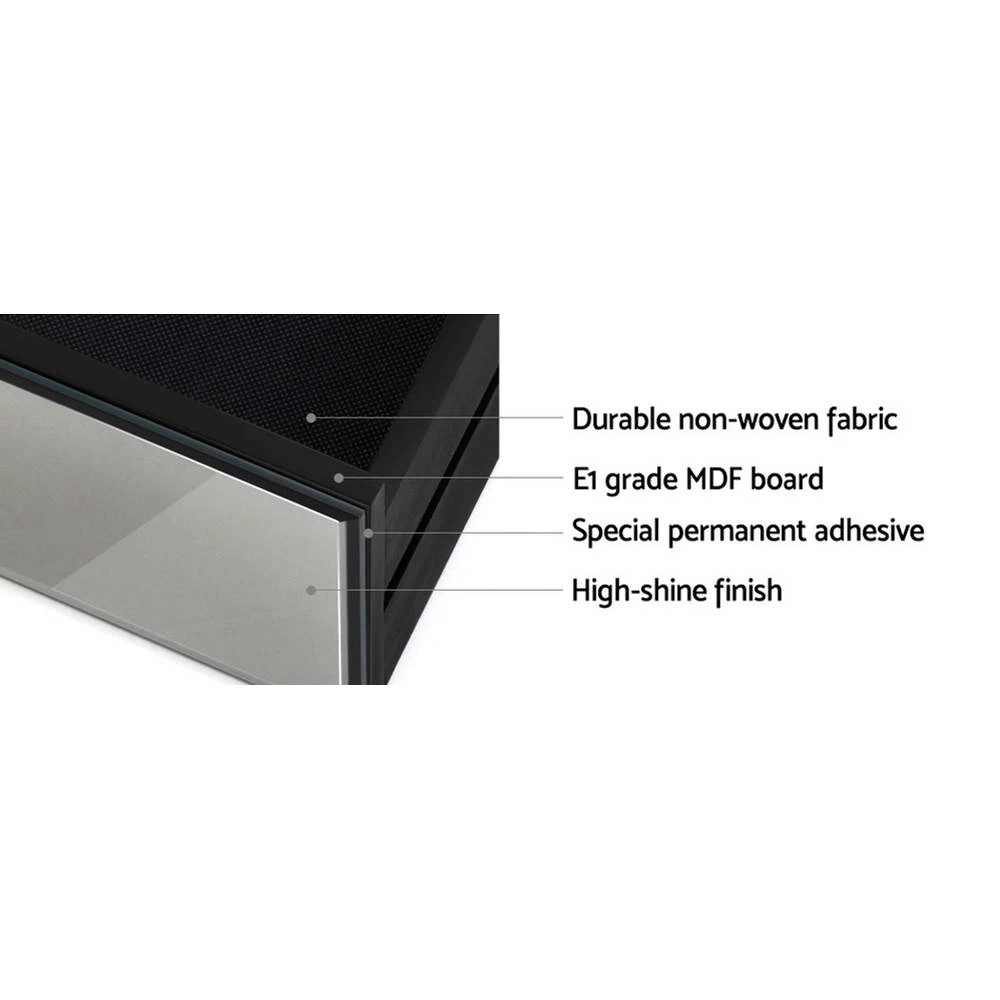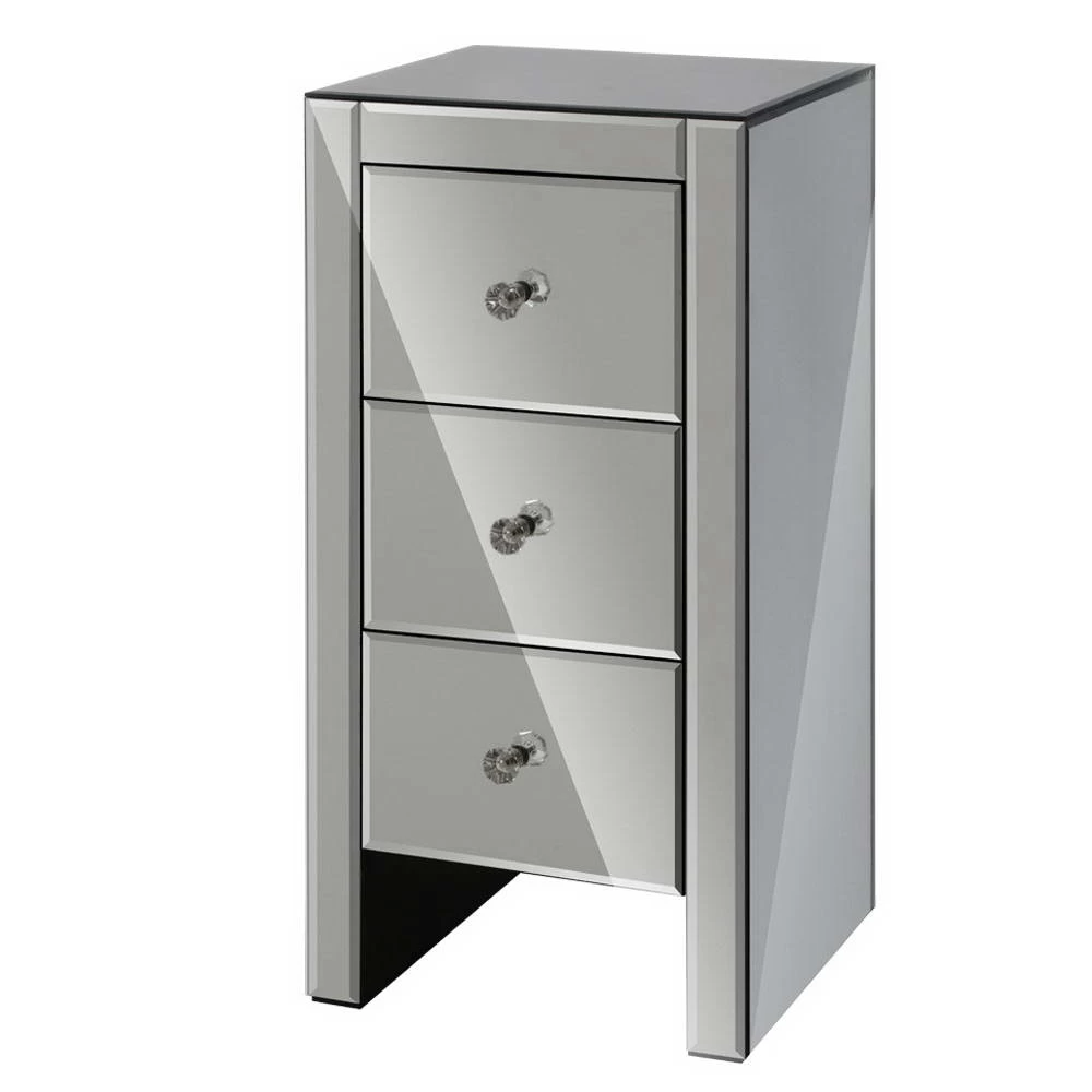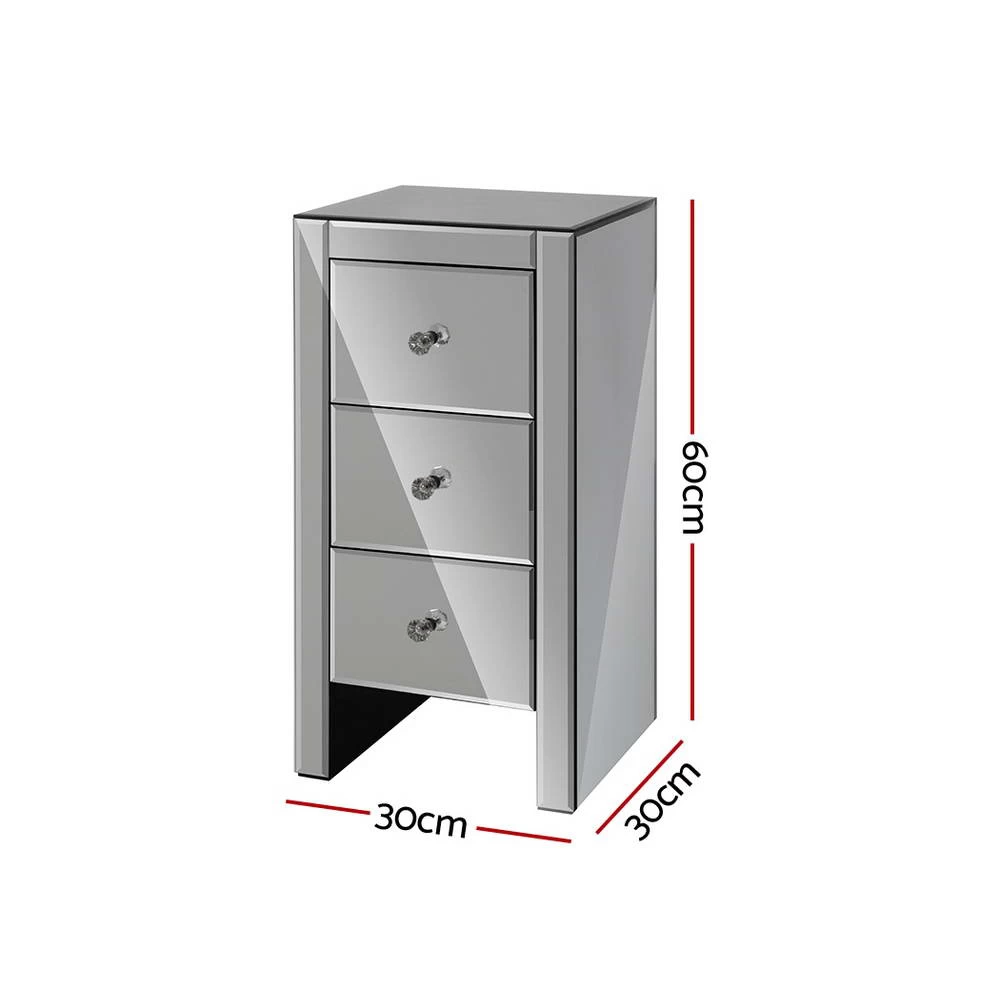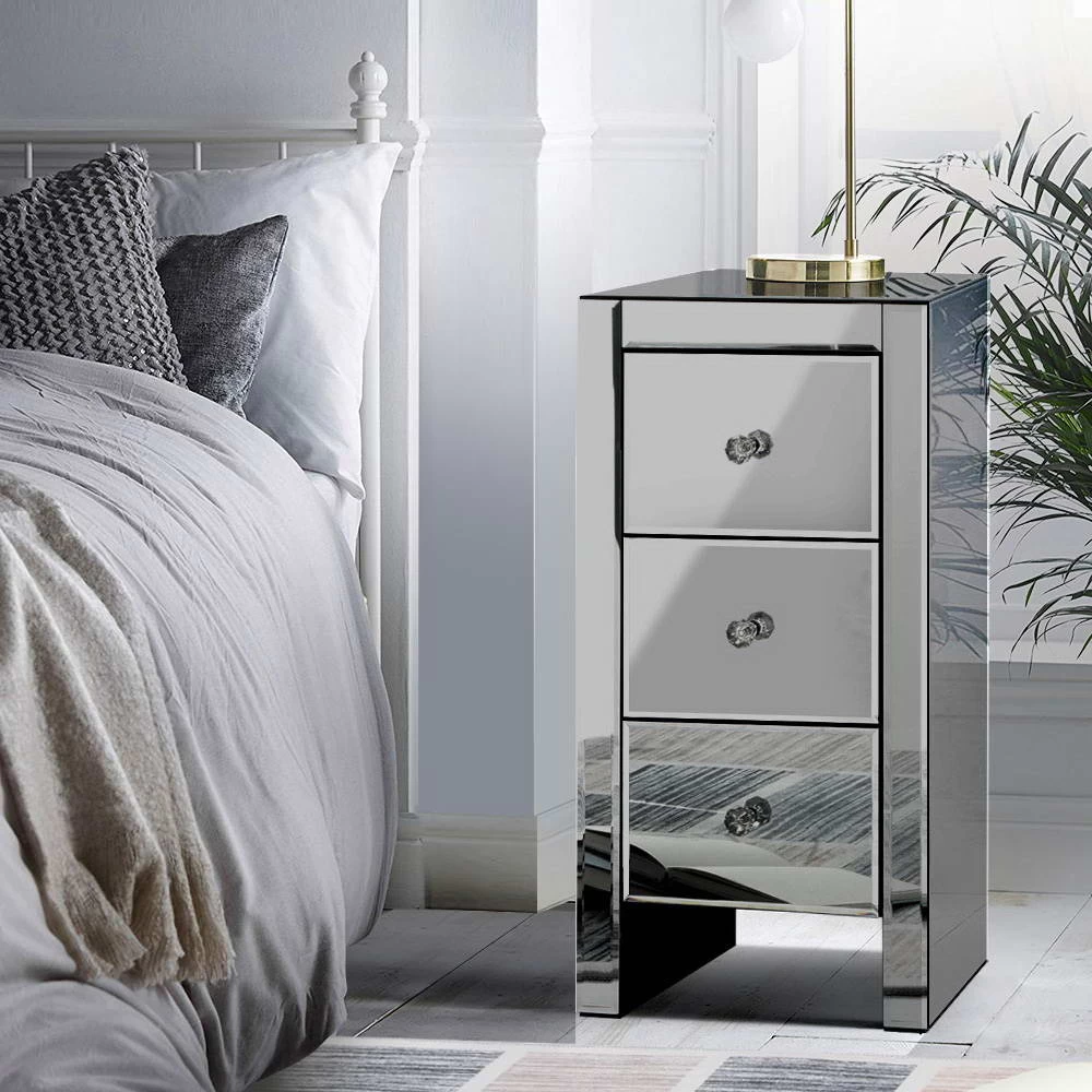 Enjoy all the glitz and glamour that comes with the Artiss Quenn Bedside Drawers. Cladded with bevelled mirror glass and a durable E1 grade MDF board frame, the elegant drawers are simply stunning from any angle that reflects its mirrored beauty. Plus, the effect also gives your room a larger-than-life look of space and size. The three drawers offer ample storage space and are fitted with coated metal sliders for smooth operation. Not least, the crystal glass effect handles also add a scintillating touch to the drawers with an exquisite appeal. Easy to maintain and clean, our bedside drawers is all about grandeur living made simple.