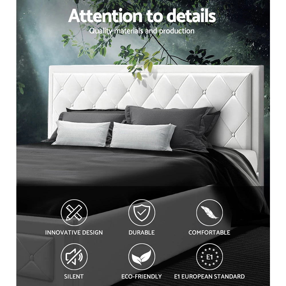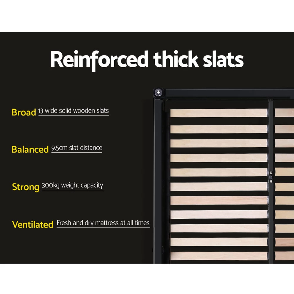 From the outside, our contemporary Artiss Tiyo Gas Lift Bed Frame looks absolutely plush. The premium PU leather tufted headboard and sides all exudes fine craftsmanship. But there is more to this luxurious bed frame than meets the eye. Lift up the frame and you will find acres of storage space under the wooden arched slat base. The gas lift system and hand strap enable you to effortlessly lift the bed to store all your seasonal beddings and linen such as extra quilts, pillows and comforters and more. The wooden arched slat base is also designed to flex appropriately so that it can better distribute the weight exerted on it. Overall, the bed frame is well-built with reinforced steel bars within its sturdy steel frame. Heavy-duty metal connectors keep the frame sturdy with additional central support from an adjustable centre support beam.