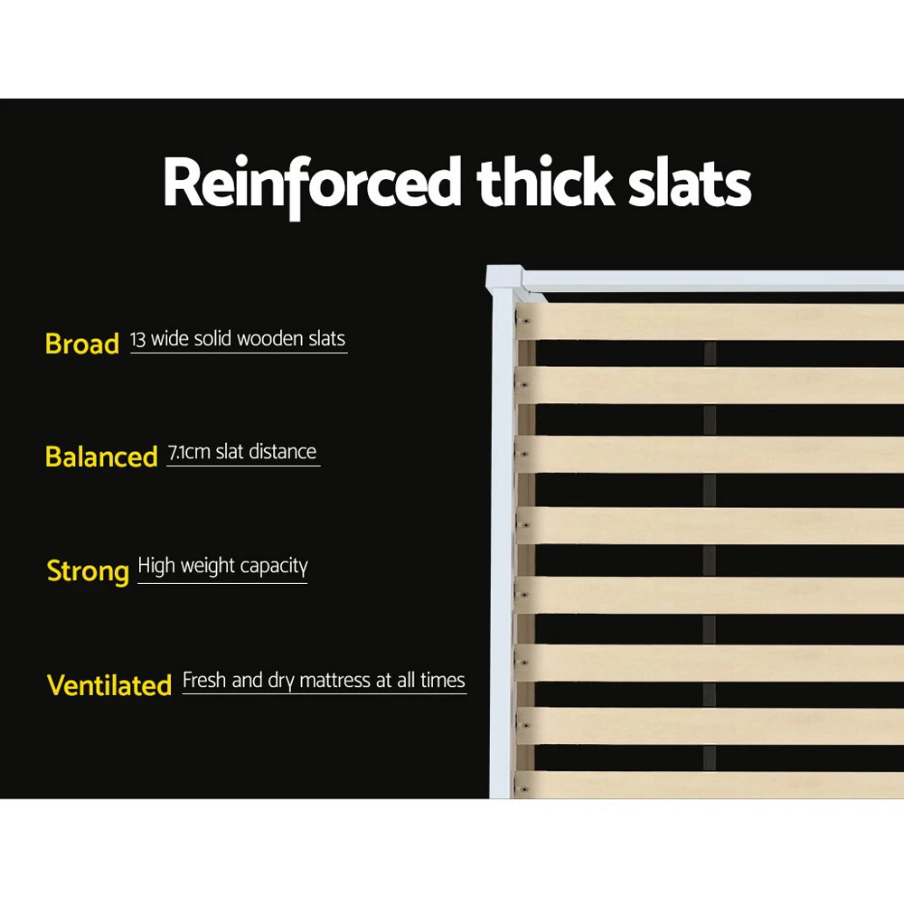 Strong and sturdy, the Bed Frame comes with a durable plywood slated base, reinforced angled brackets for long term support, stylish headboard, heavy-duty steel fixings and smooth edges all round. Finished in a non-toxic, eco-friendly white paint, the neutral-coloured Bed Frame makes for easy décor coordination with any bedroom.