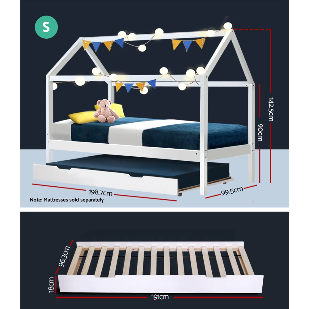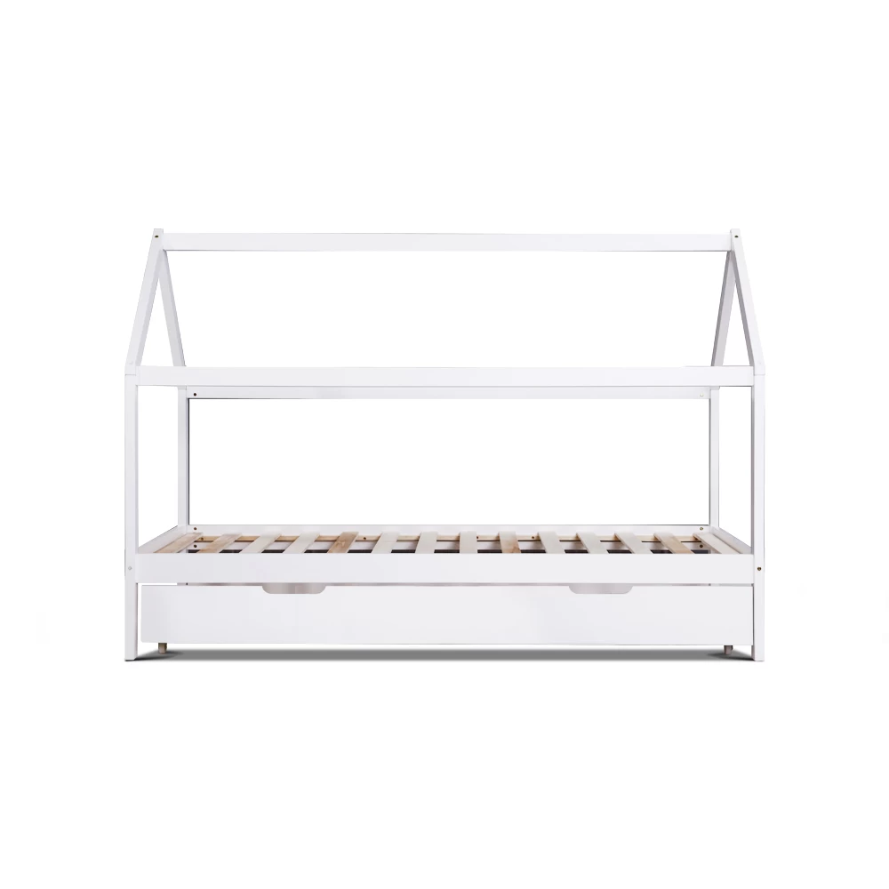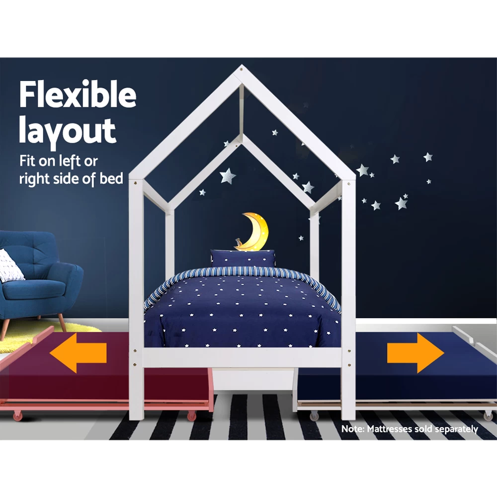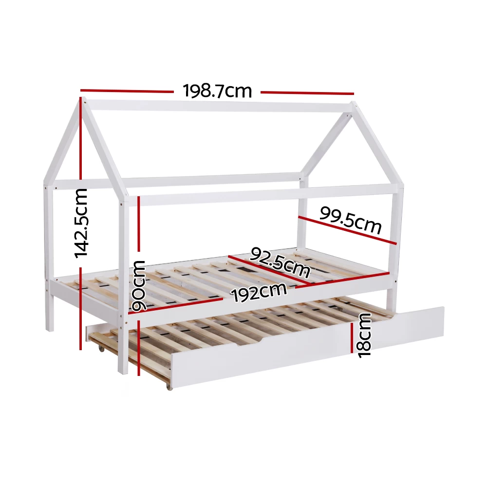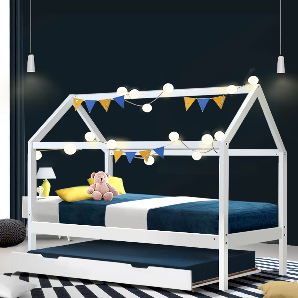 Made of solid pine wood, our Artiss HOLY Trundle Bed Frame is an all-round functional design that is compatible with most standard single-sized mattresses and ideal for use by your growing children. Strong and sturdy, the bed frame is constructed in a lovely house shape for a cosy ambience and has a durable plywood slatted base, reinforced brackets for long term support, heavy-duty steel fixings and smooth edges all round. It also comes with an under-bed trundle frame for another mattress, so that you always have an instant extra bed for pyjama parties or unexpected guests. Finished in a non-toxic, eco-friendly white paint, the neutral-coloured bed frame makes for easy décor coordination with any bedroom. So, the next time you need a contemporary bed frame that has quality written all over it, make it our Artiss HOLY Bed Frame.