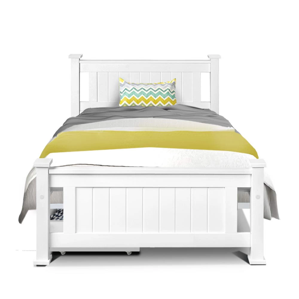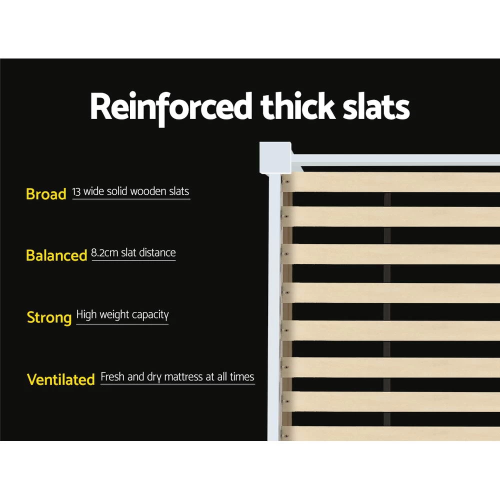 Made of natural pine wood, the Rio bed frame is ideal for your kids as it for any adult. Strong and sturdy, the bed frame comes with a solid timber slated base, stylish headboard, heavy duty steel fixings and smooth edges all round. Finished in a non-toxic, eco-friendly white paint, the neutral coloured bed frame makes for easy decoration coordination with any bedroom. The bed frame becomes an instant storage area with acres of space for your bedding essentials. Go extra neat and tidy. So create more and expand your home storage capacity with the Artiss Rio Bed Frame. Get yours today.