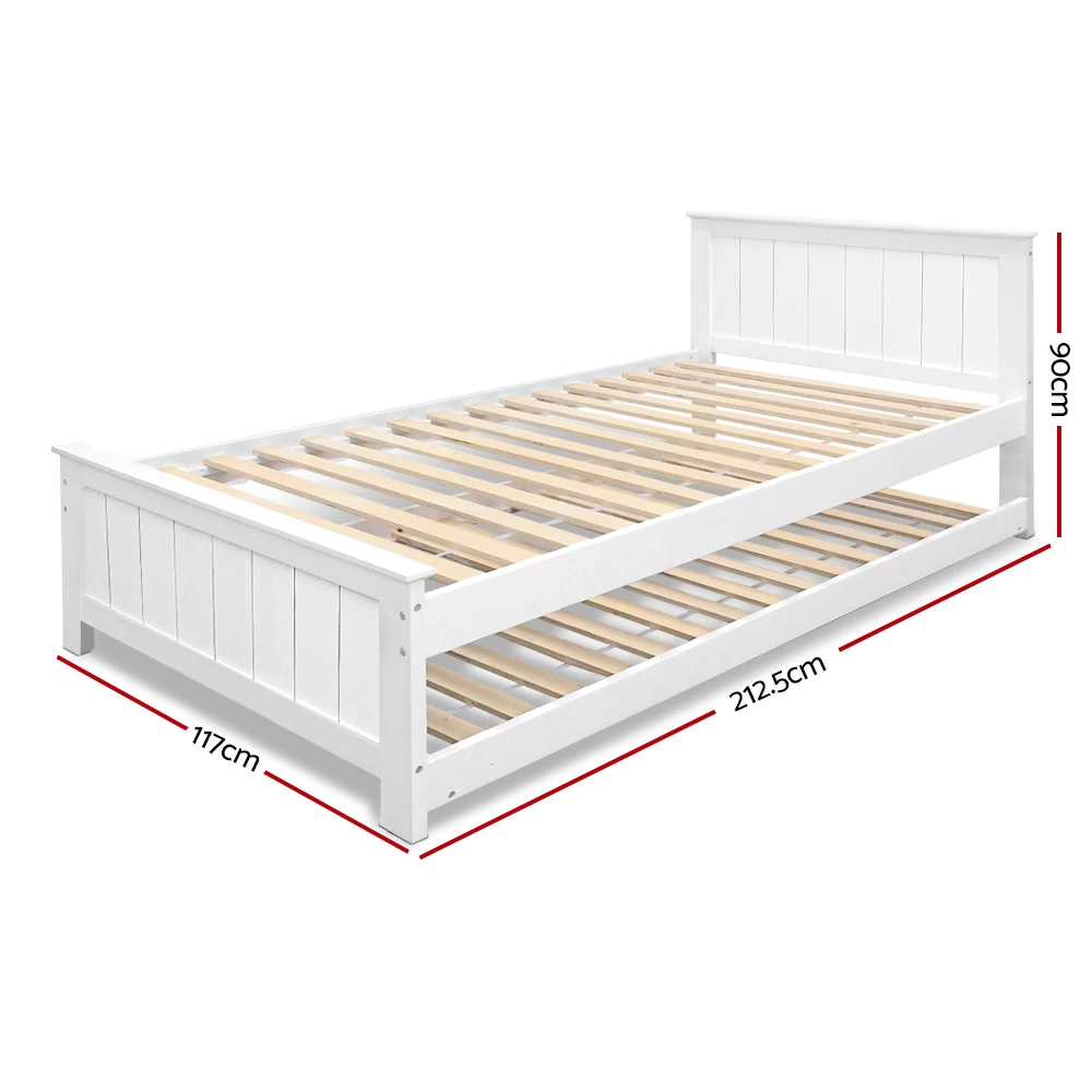 Sometimes finding the space to store a spare bed can be a hassle if your home is already a ‘full house’. And when friends and relatives drop by to spend a night or two, it can be a real dilemma getting them an extra bed. Well, not if you have our Artiss Elvis Trundle Bed. When not in use, the spare bed is stored under the normal bed. Comes the time to use it, just slide it out on either side and the extra bed is ready to welcome your weary guest. Both bed frames are made of solid pine wood with quality timber slats to spread the weight evenly. Not least, the bed frames are designed to fit Australian king single mattresses with minimum hassle.