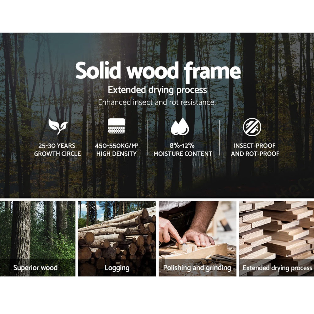 Within the frame, a highly flexible wooden arched slat base allows the bed to flex properly so that a person who lies on the bed can move around without unduly disturbing the other. An adjustable centre support beam keeps the bed steady and provides additional central support to the structure. Not least, the sturdy steel frame is also reinforced with steel bars and held together by heavy duty metal connectors so that you never have to worry about the stability or durability of the bed frame.