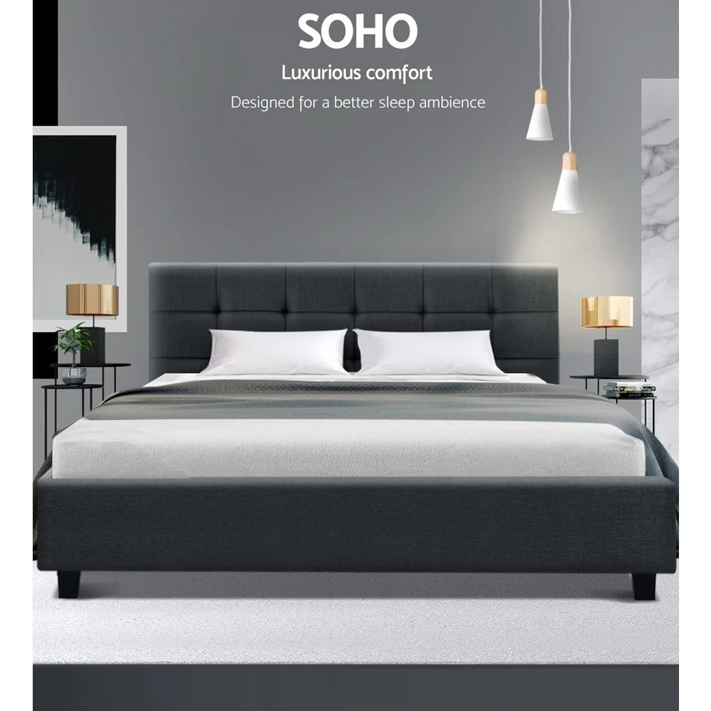 Turn your bedroom into a luxurious pad with our Soho Bed Frame. Constructed with a sturdy steel frame reinforced with metal bars and heavy-duty connectors, the bed frame is also padded with high density foam and upholstered in breathable non-woven premium linen fabric for a soft and comfortable touch. The bed frame features a wooden arched slatted base that helps to distribute weight evenly across the frame and a centre support strut to provide added stability to the overall structure. Of particular interest too is the tufted headboard that really gives the bed frame a designer-class status. Simply oozing with elegance and sophistication in every detail.