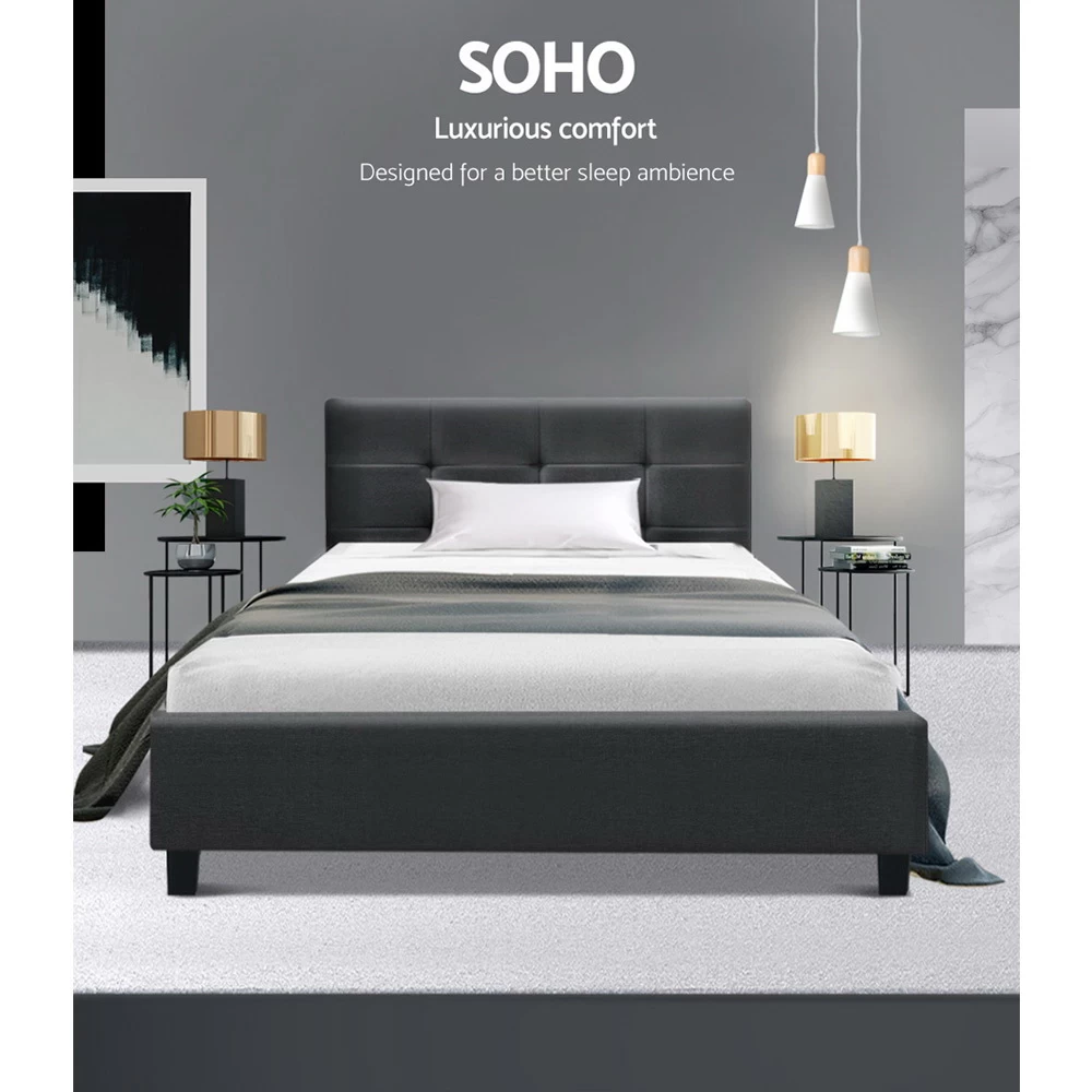 Turn your bedroom into a luxurious pad with our Soho Bed Frame. Constructed with a sturdy steel frame reinforced with metal bars and heavy-duty connectors, the bed frame is also padded with high density foam and upholstered in breathable non-woven premium linen fabric for a soft and comfortable touch. The bed frame features a wooden arched slatted base that helps to distribute weight evenly across the frame and a centre support strut to provide added stability to the overall structure. Of particular interest too is the tufted headboard that really gives the bed frame a designer-class status. Simply oozing with elegance and sophistication in every detail.