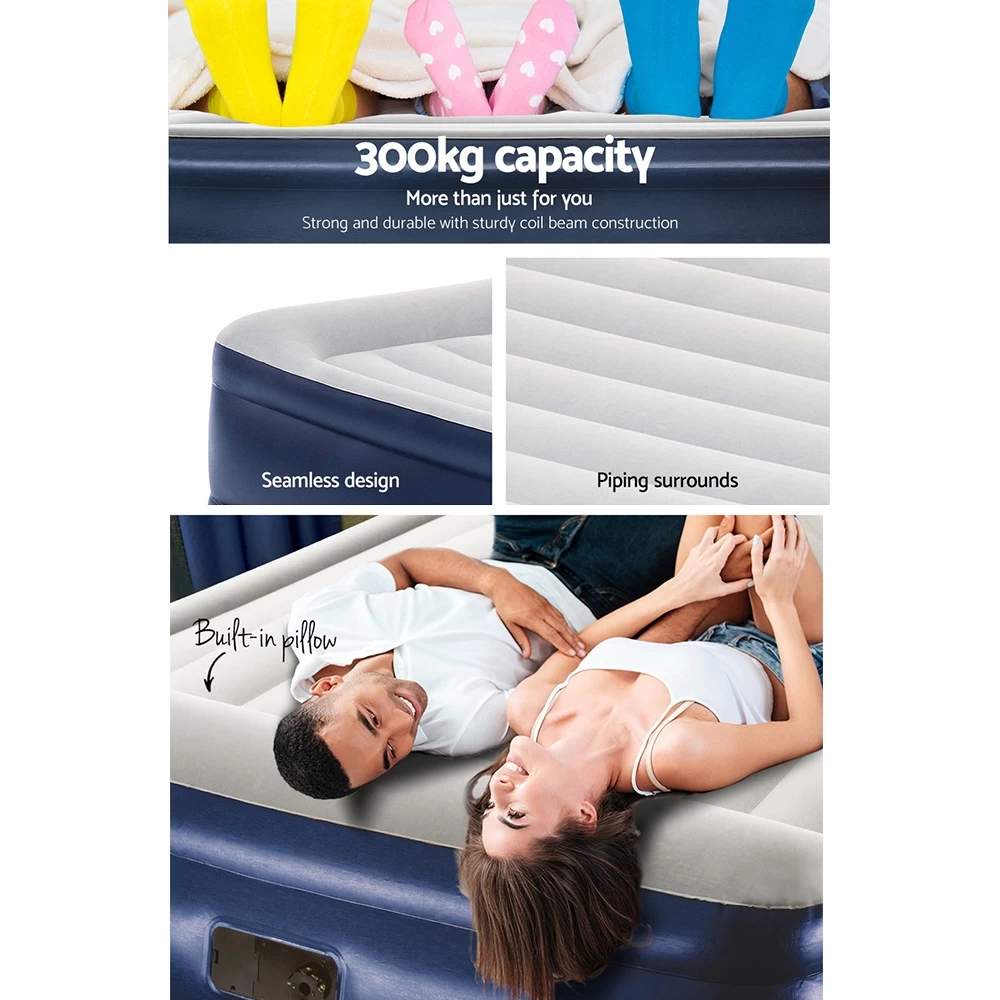 Featuring a comfortable flocked sleeping surface, the King size air bed provides a smooth and comfy sleep each and every night. Designed with a sturdy I-beam construction, this quality air bed is suitable for both indoor and outdoor use. Inflates in just 300 seconds, You will have an instant bed ready to go whenever the situation calls for a spare mattress. Portable, easy to store and effortless to set up, this convenient air mattress provides the perfect balance of comfort, practicality and affordability.