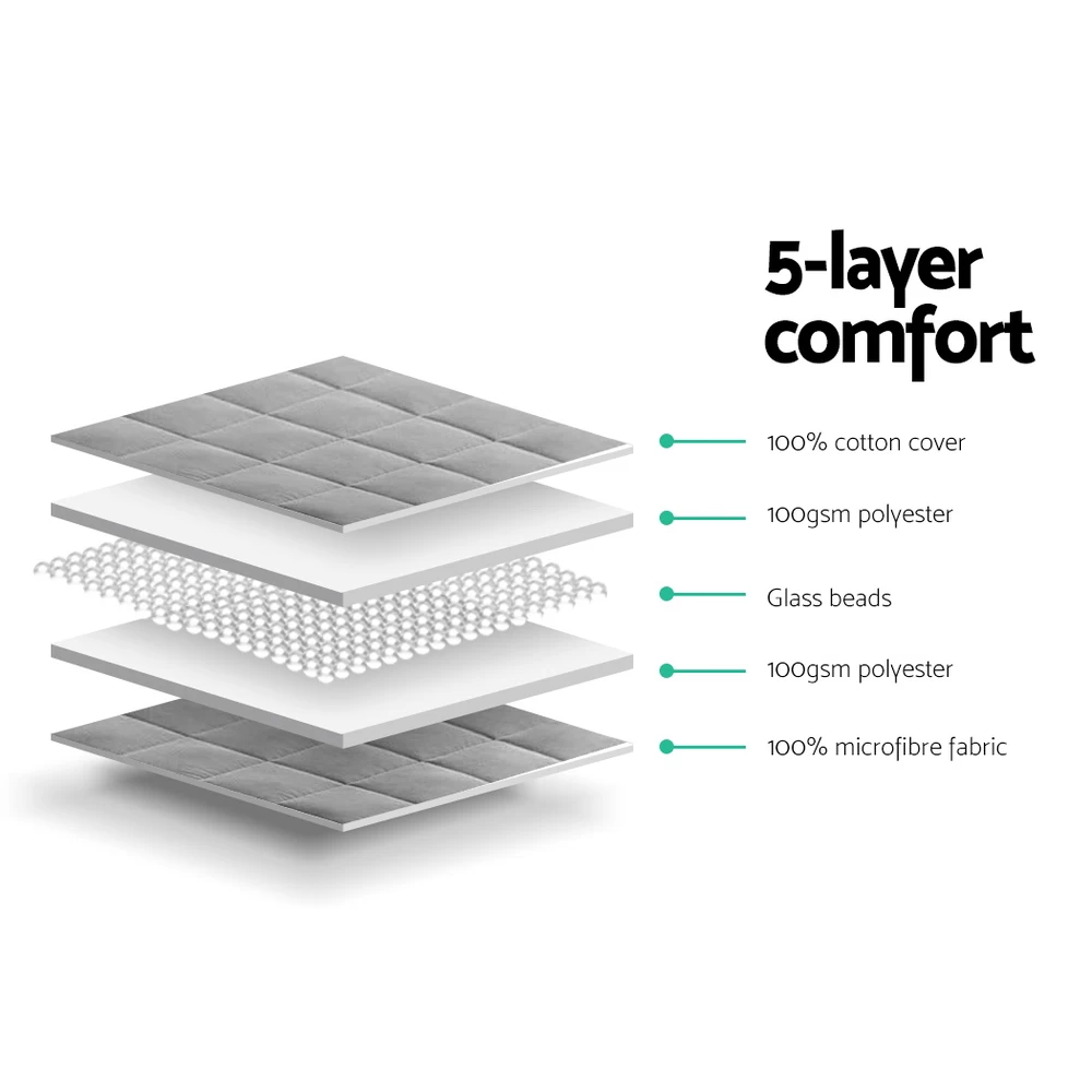 The science behind better sleep lies with a Giselle Bedding Weighted Blanket. It uses the therapeutic power of Deep Touch Pressure Simulation (DTPS) to stimulate pressure points throughout the body, thereby contributing to enhanced sleep, mood and relaxation. Our weighted blanket is engineered to be between 8% and 15% of your body weight to relax the nervous system by simulating the feeling of being hugged or held. This boosts serotonin and melatonin levels and decreases cortisol levels improving your heart rate and blood pressure. In short, you get healthier sleep and awake feeling refershed and re-invigorated. Made of 100% cotton for the top and 100% microfibre for the bottom, the weighted blanket is filled with polyester and glass beads to create the right amount of pressure for a soothing hugging sensation. The weighted blanket is also close-fitting and conforms to your body shape and adapts to any sleeping posture easily. Not least, its excellent leak-proof stitching and 5-layer comfort ensures that the weighted blanket is ever so durable and comfortable with every use. The weighted blanket is machine washable for total convenience.