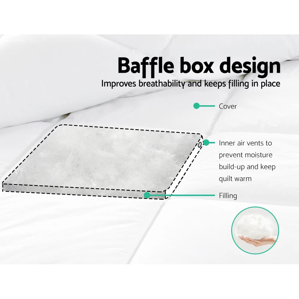 Indulge in luxury comfort with our finely constructed Giselle Bedding Goose Down Feather Quilt. It is the perfect quilt to provide you with seasonal comfort and a great feeling at all times. Filled with goose down feathers with 800gsm weight, the quilt embodies a baffle construction that prevents shifting of the filling and helps to expand the down to retain heat, providing optimal warmth. The goose down feathers are lightweight and provide true warmth without added weight. Plus, the quilt is mite and mould-resistant and easy to maintain. Not least, the cover itself is 100% pure cotton with a 233 thread count for exceptional quality.