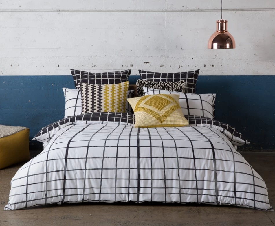 Features a clean-lined, plaid pattern in black and white for a structural look