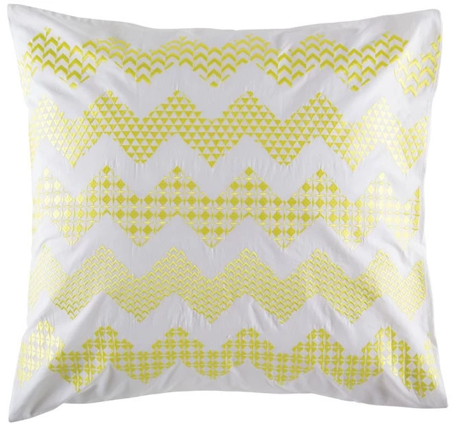 Graphic geometric embroidery accentuates this textured citrus and white design.